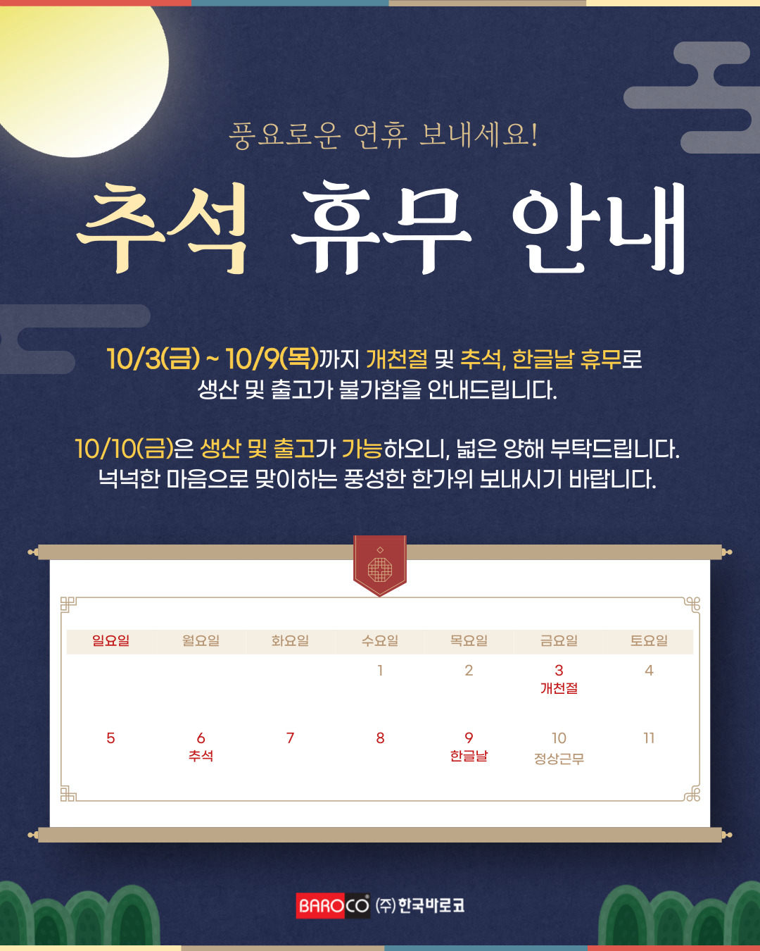 다가오는 추석을 맞이하며 휴무 공지 안내드립니다.